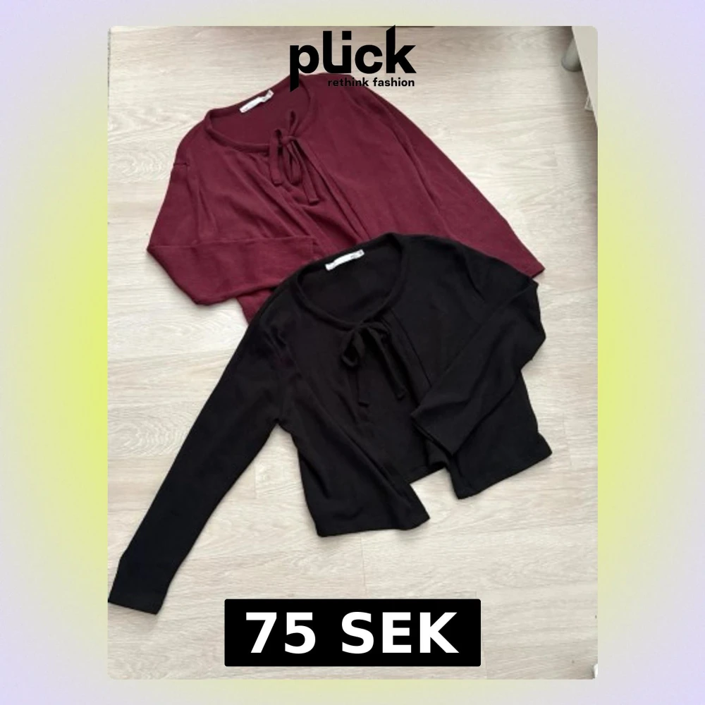 Två trendiga koftor med knytning framtill, en i vinrött och en i svart. Båda har rund halsringning och långa ärmar. Perfekta att slänga över en topp för en chill look. Materialet ser ut att vara mjukt och stretchigt.
