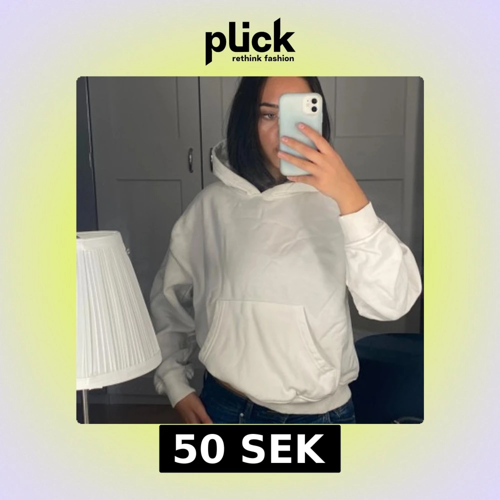Vit hoodie med klassisk huva och stor magficka. Tröjan har ribbade muddar vid ärmslut och nederkant, samt en loose passform som ger en chill vibe. Materialet är mjukt och känns som bomull, perfekt för att slänga på sig när man vill vara bekväm. Den har dock ett super litet hål som visas på bild