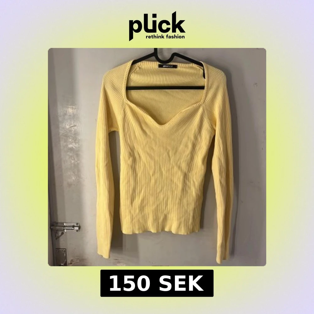 Säljer en ljusgul ribbad långärmad topp från Gina Tricot med uringning och figurnära passform. Perfekt att styla med jeans eller kjol för en fräsch look.