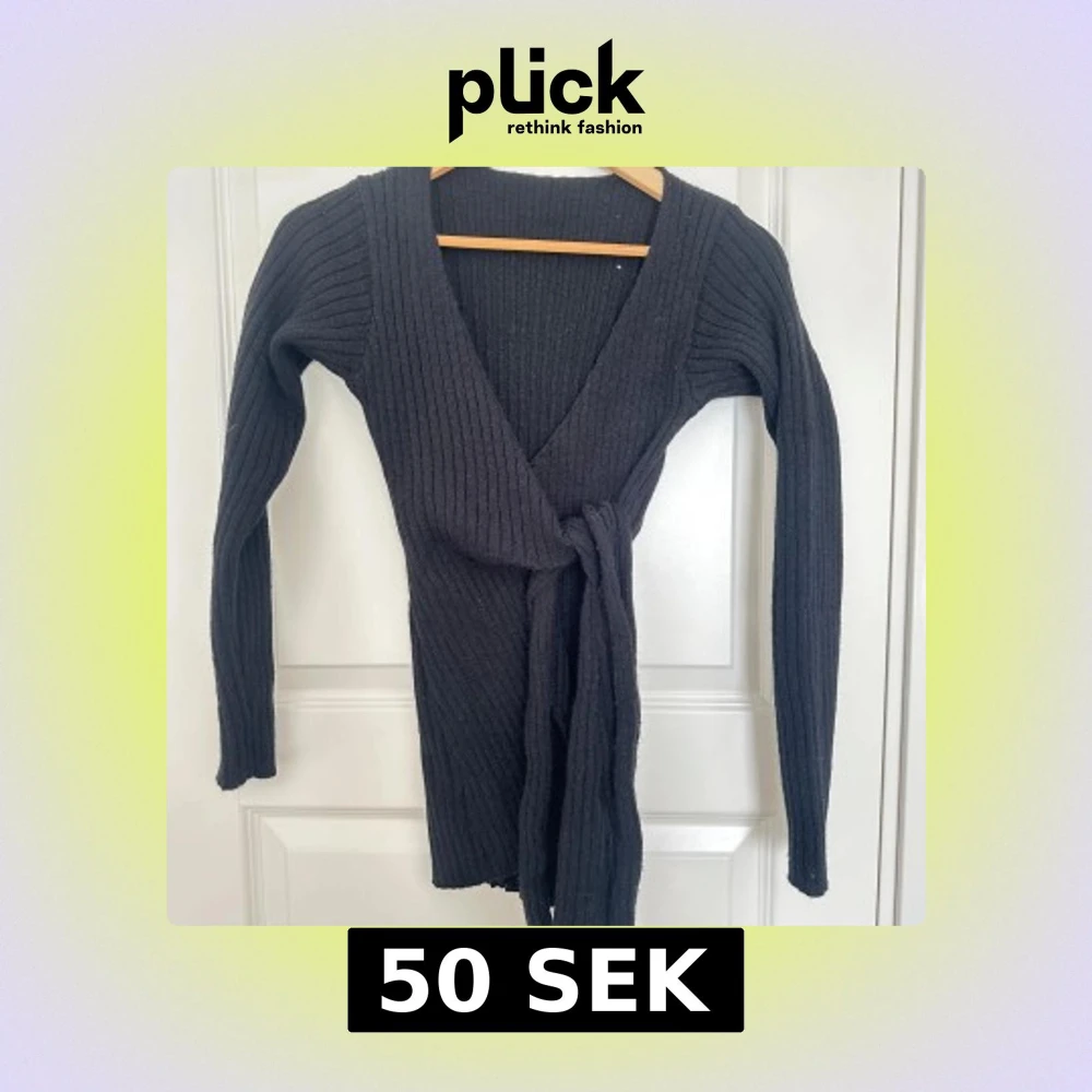 Säljer en svart ribbad omlottkofta med knytband i midjan. Koftan är v-ringad och har långa ärmar, perfekt för kyligare dagar. Aldrig använd.