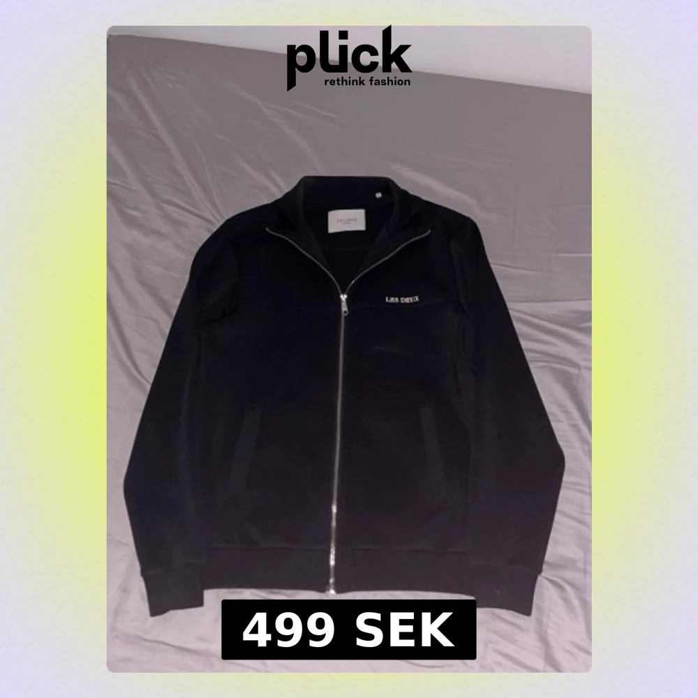Säljer en svart ziptröja från Les Deux med stilren design och diskret logga på bröstet. Tröjan har hel dragkedja, ståkrage och två fickor framtill. Materialet känns mjukt och har en lätt glansig finish, perfekt för en clean och modern look.