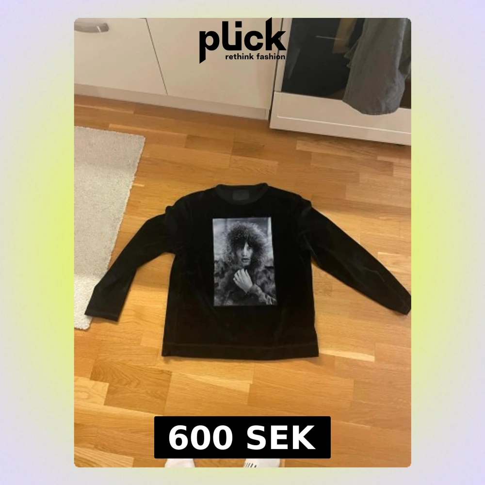 Svart långärmad tröja från Limitato i sammet med en stor svartvit fotoprint på bröstet. Tröjan har en mjuk känsla och är tillverkad i bomull och polyester. Perfekt för dig som vill ha något unikt och stilrent.
