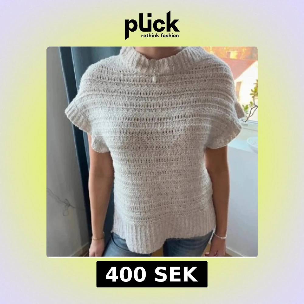 Säljer en mysig beige stickad tröja med korta ärmar och ribbad struktur. Perfekt för lager-på-lager under kyligare dagar. Tröjan har en hög krage som ger extra värme och stil. Lånad bild🥰
