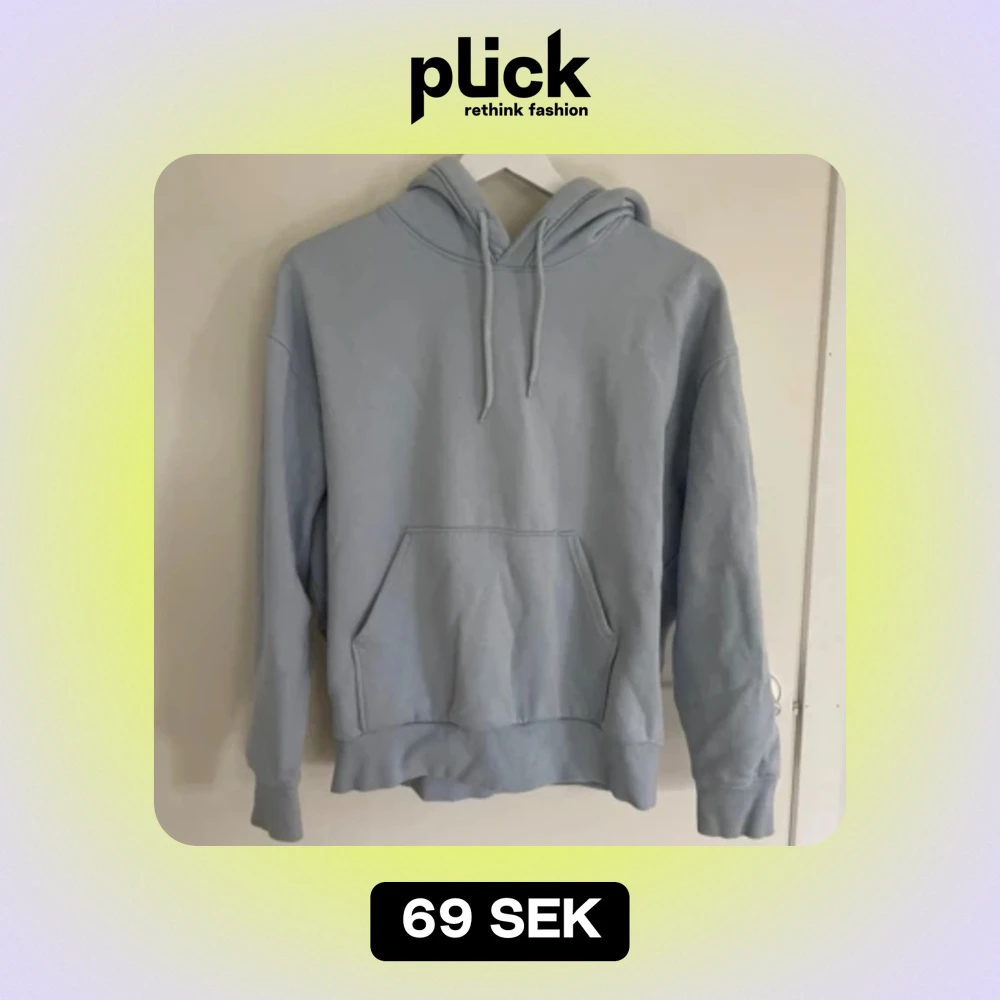 Säljer en supermysig ljusblå hoodie i bra skick. Den har en klassisk känguruficka och en justerbar huva med dragsko.