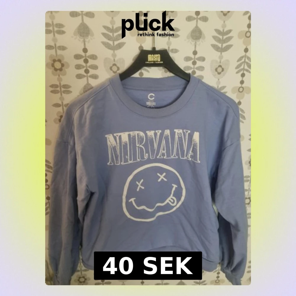 Säljer en ljusblå sweatshirt med Nirvana-tryck i vitt framtill. Tröjan har rund hals, långa ärmar och är gjord i mjuk bomull. Perfekt för dig som gillar bandtröjor och vill ha en avslappnad stil.