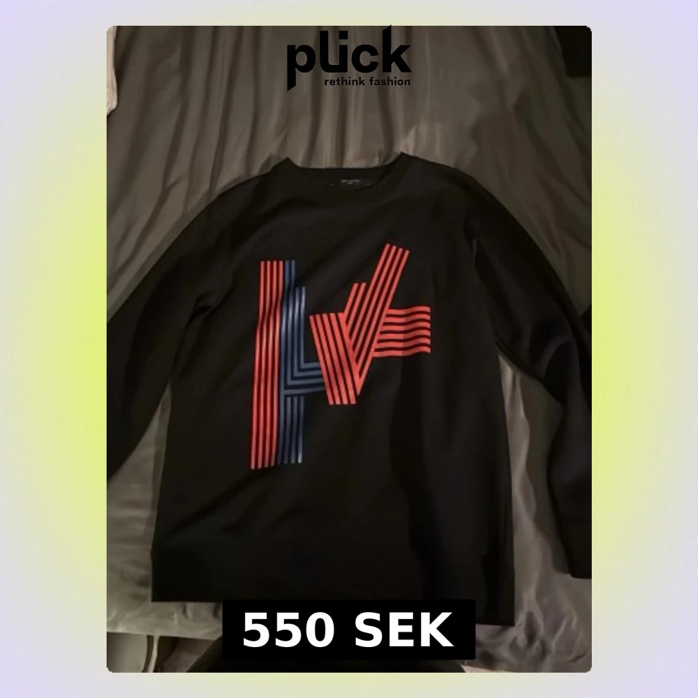 Säljer en svart sweatshirt från Louis Vuitton med ett stort grafiskt LV-tryck i rött och blått på framsidan. Tröjan har rund halsringning och långa ärmar. Säljer den just för att den inte passar mig eftersom jag är 190cm och den blir lite för kort på midjan. Passar perfekt för 165-185