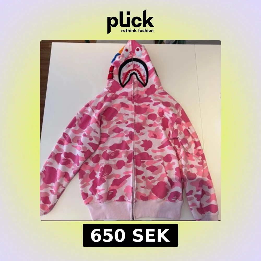 Säljer en rosa camo hoodie från BAPE med dragkedja och ikonisk hajdesign på huvan.