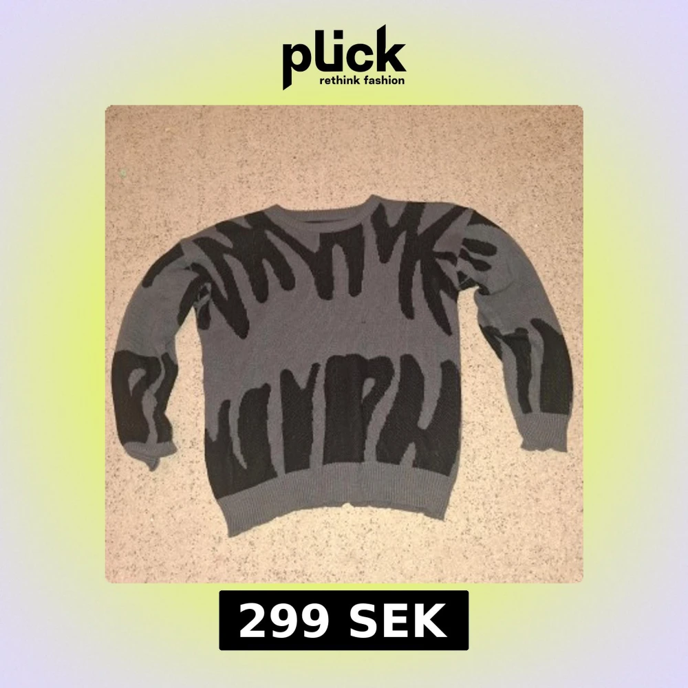 Säljer en grå stickad tröja från Manfinity i storlek M. Tröjan har ett unikt svart mönster som påminner om zebra eller abstrakta former. Rund halsringning och ribbade muddar vid ärmslut och nederkant.