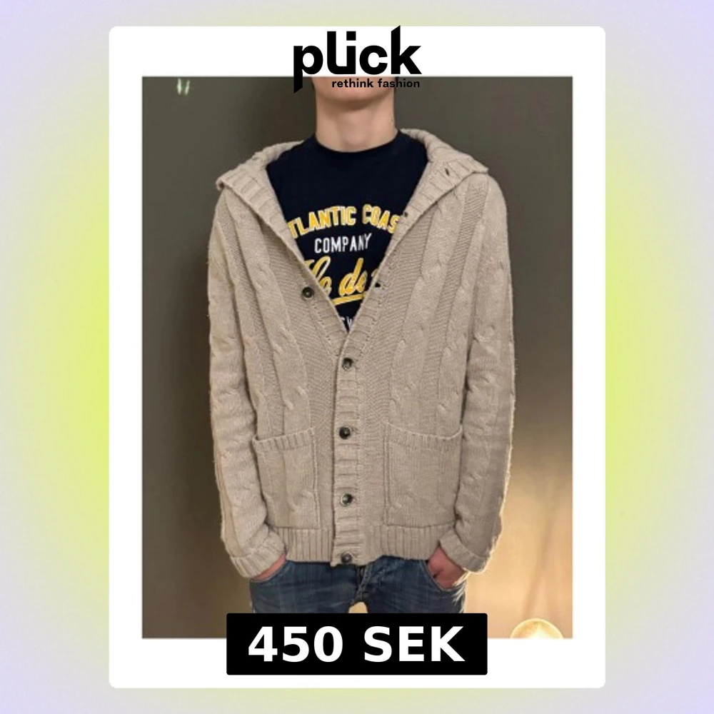 Säljer en beige stickad kofta med huva och grovt kabelstickat mönster. Koftan har knappar framtill, två stora fickor och förstärkta armbågar i grått tyg. Perfekt för lager-på-lager under kyliga dagar.