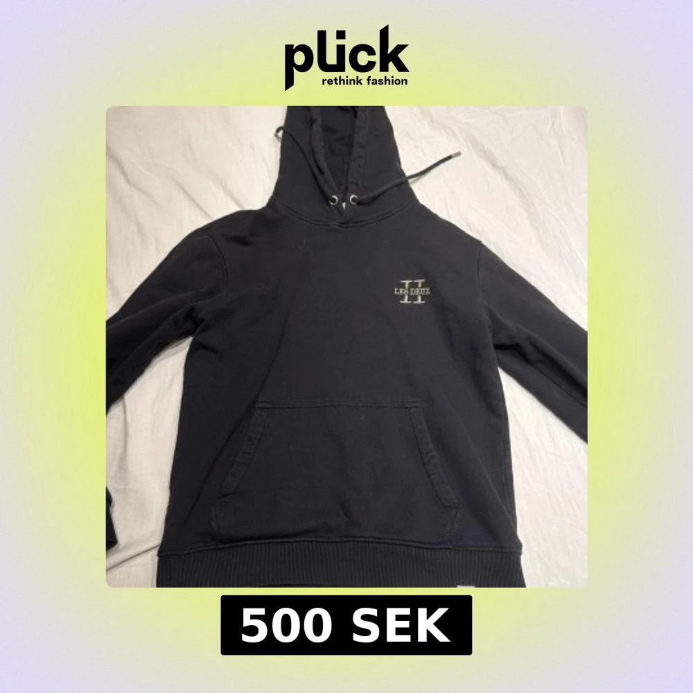 Säljer en stilren svart hoodie från Les Deux med en praktisk magficka och justerbar huva. Perfekt för en avslappnad look. Diskret logga på bröstet.