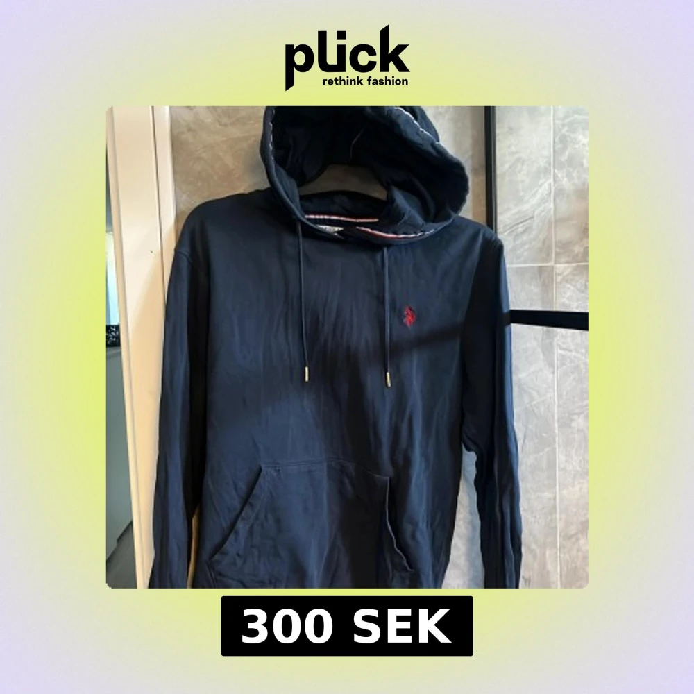 Säljer nu en marinblå hoodie från polo med röd logga broderad på bröstet. Tröjan har huva med snörning och en klassisk känguruficka framtill. Ränder i rött, vitt och blått på insidan av huvan ger en extra detalj.