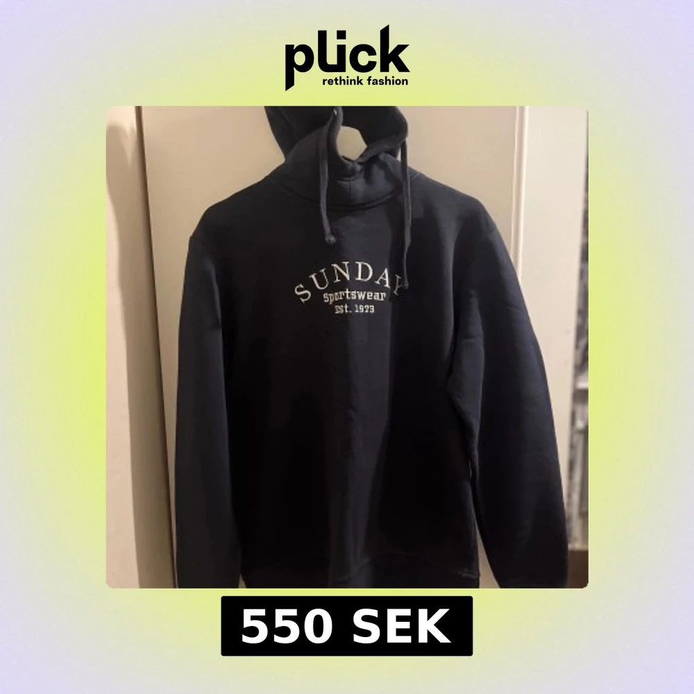 Säljer en svart hoodie från Sunday Sportswear med texten 'Sunday Sportswear Est. 1973' på bröstet. Den har en justerbar huva med dragsko och långa ärmar. Perfekt för en avslappnad stil.