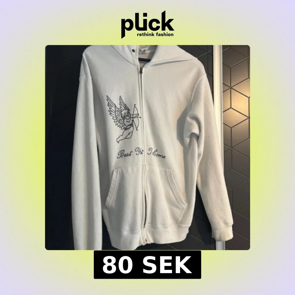 Säljer en vit hoodie med dragkedja från Rhinestone. Den har ett unikt ängelmotiv och text på framsidan. Perfekt för en avslappnad stil. Hoodien har långa ärmar och en bekväm passform.