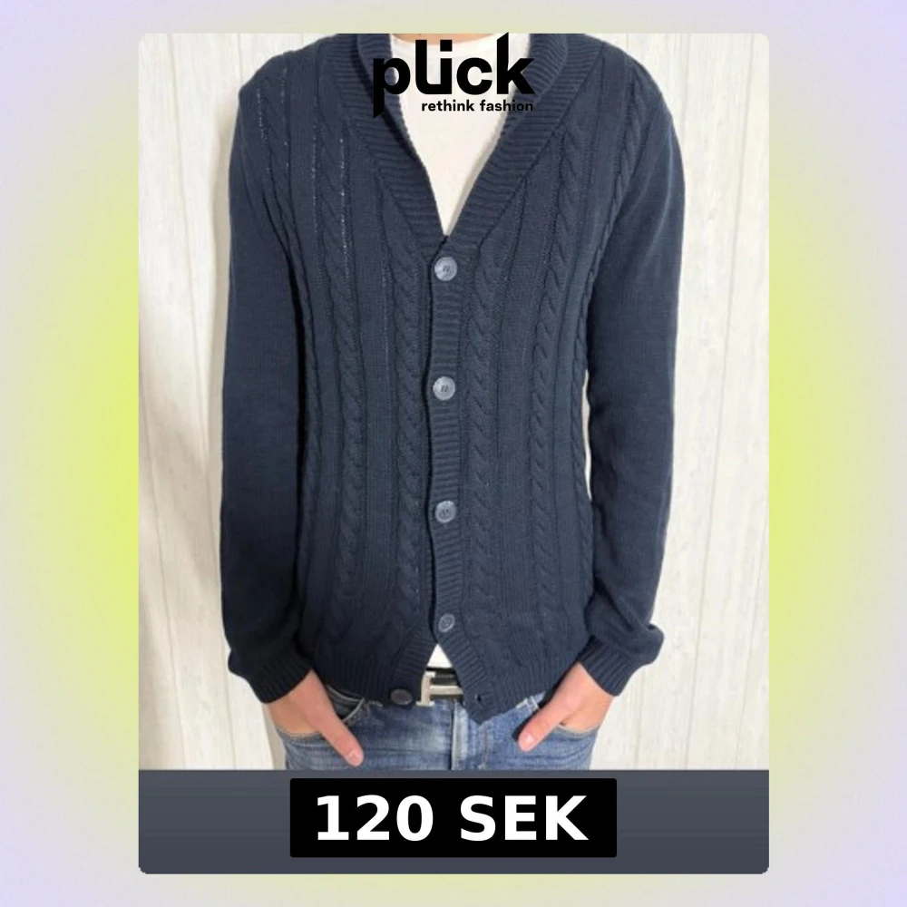 Snygg mörkblå stickad kofta. Storlek M. Perfekt att slänga på över en t-shirt. Använd ett fåtal gånger. Vid fundering är det bara att hojta till !