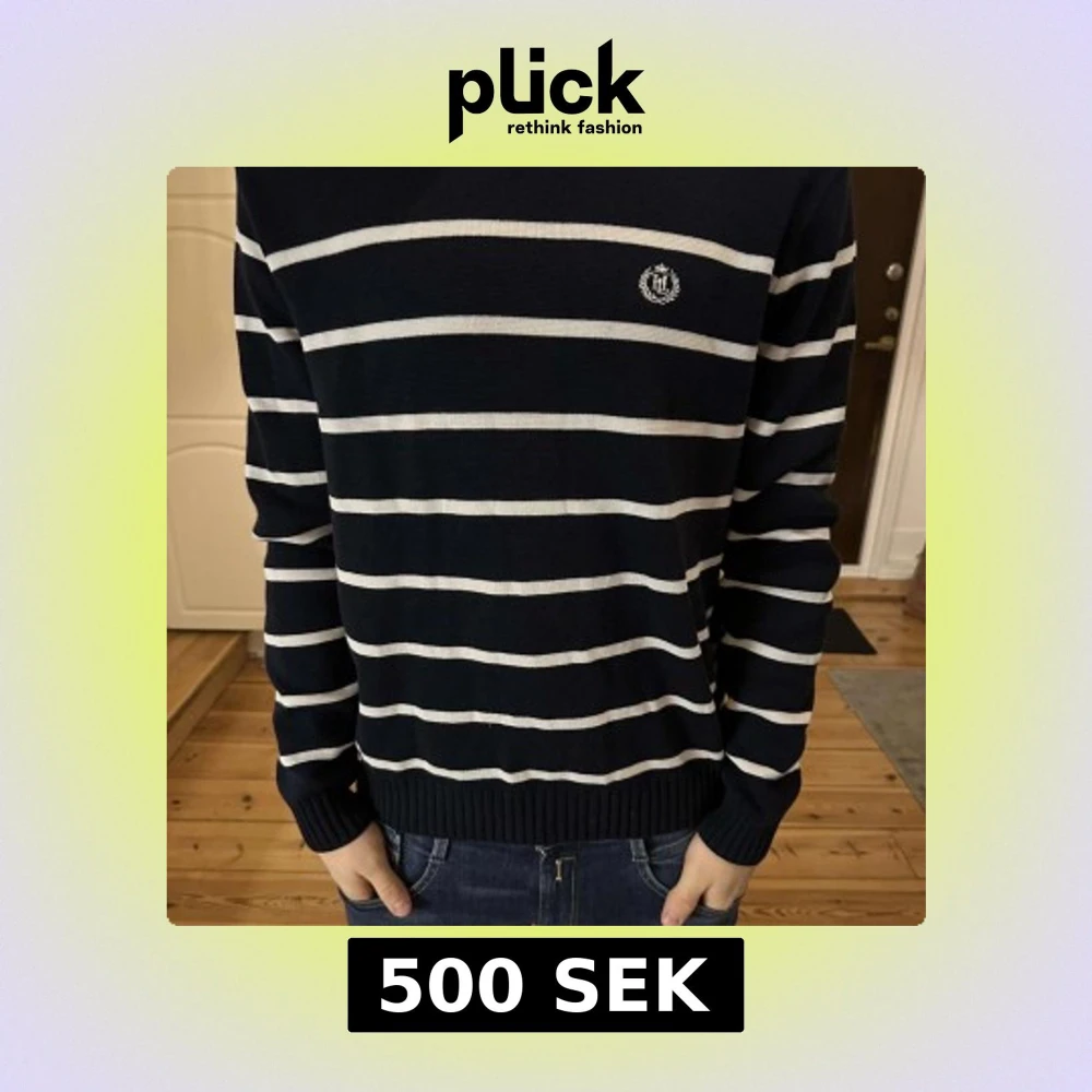 Snygg marinblå tröja från Henri Lloyd med vita ränder och broderad logga på bröstet. Knappt använd, säljs ej längre.