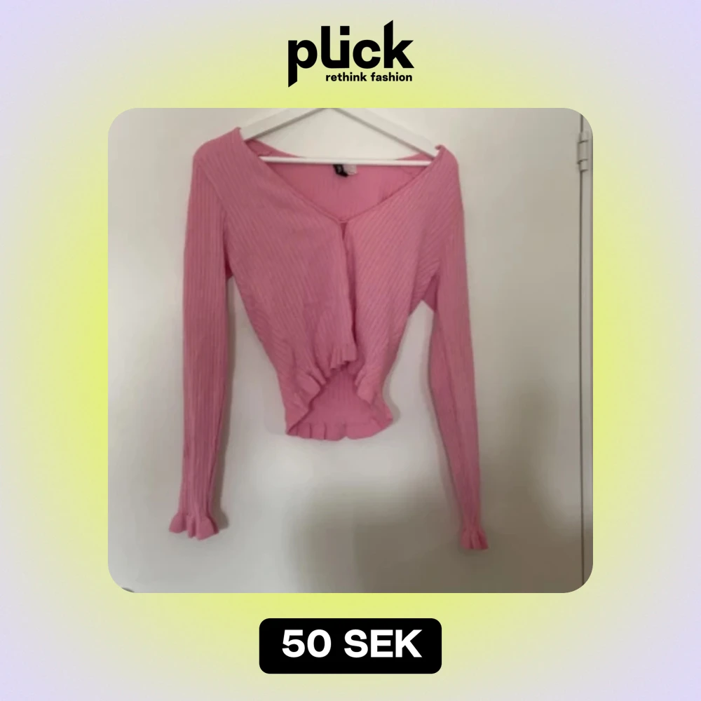 Säljer en superfin rosa ribbad tröja från H&M Divided. Den har en v-ringad design och långa ärmar med volangdetaljer vid ärmsluten. Perfekt för både vardag och fest! 💖