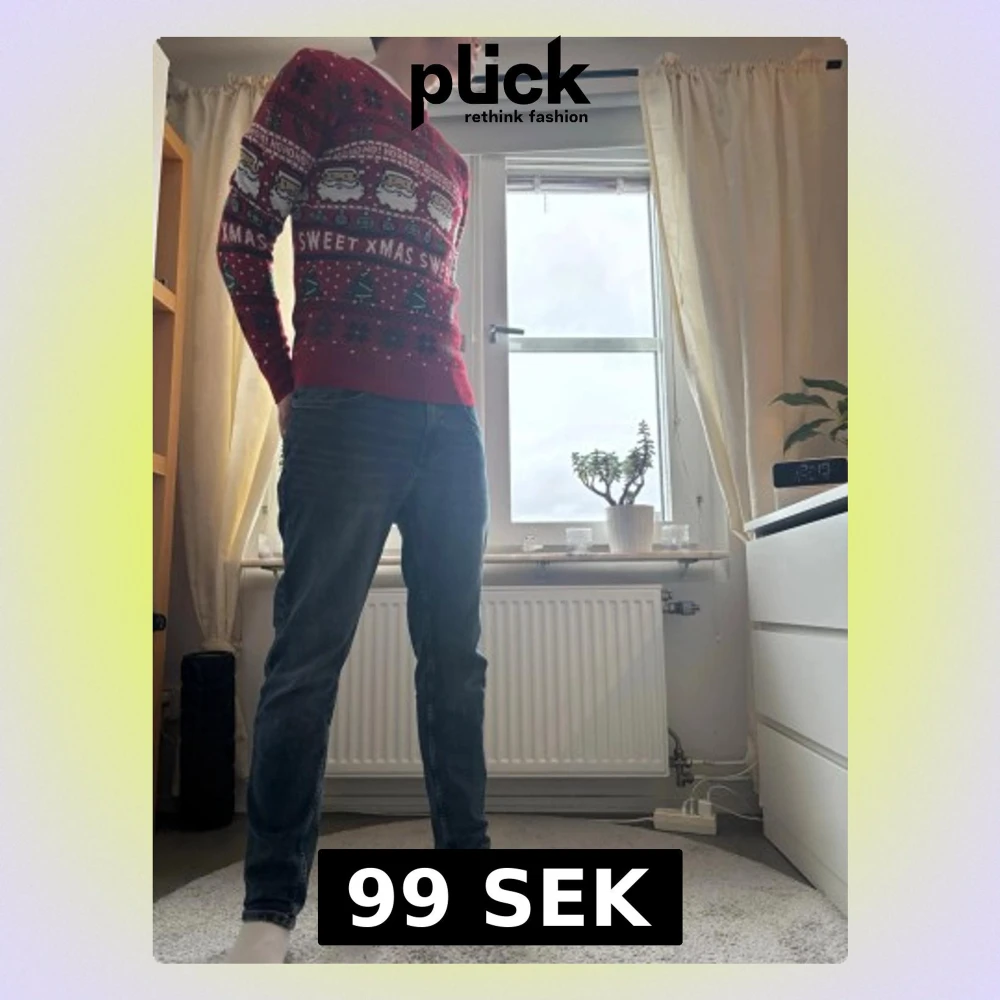 Säljer en röd jultröja med mönster av tomtar, granar och snöflingor samt texten 'XMAS SWEET' och 'HO HO HO' över bröstet. Tröjan har rund halsringning och långa ärmar. Perfekt för att maxa julstämningen!