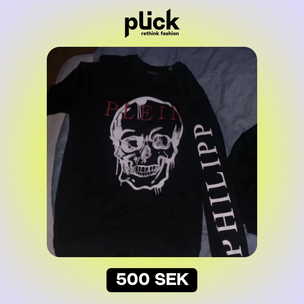 Säljer en cool svart långärmad tröja från Philipp Plein med ett stort vitt dödskalletryck på framsidan och röd text. Perfekt för en edgy look! Tröjan har normal passform och är i bra skick.
