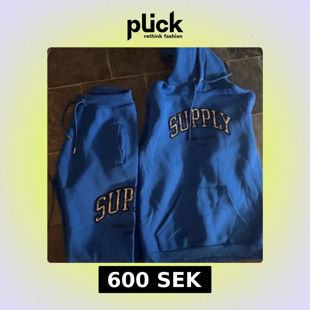 Blå hoodie från Supply med stor vit och svart text på bröstet. Tröjan har huva med snörning och en stor magficka. Perfekt för dig som gillar streetwear och vill ha en skön och avslappnad stil.