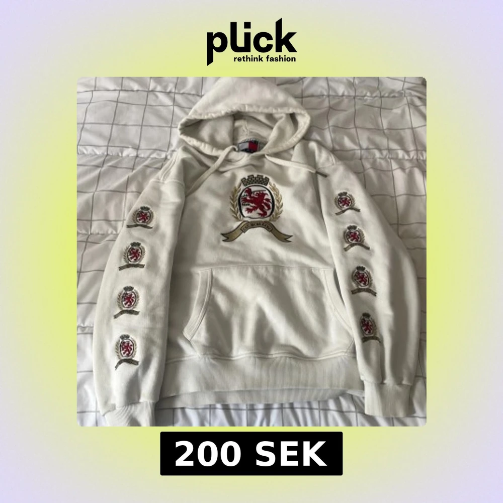 Snygg vit hoodie från Tommy Jeans med broderat lejonemblem på bröstet och flera broderade märken längs båda ärmarna. Klassisk huva med snörning och stor känguruficka framtill. Perfekt för dig som gillar streetwear med preppy touch.
