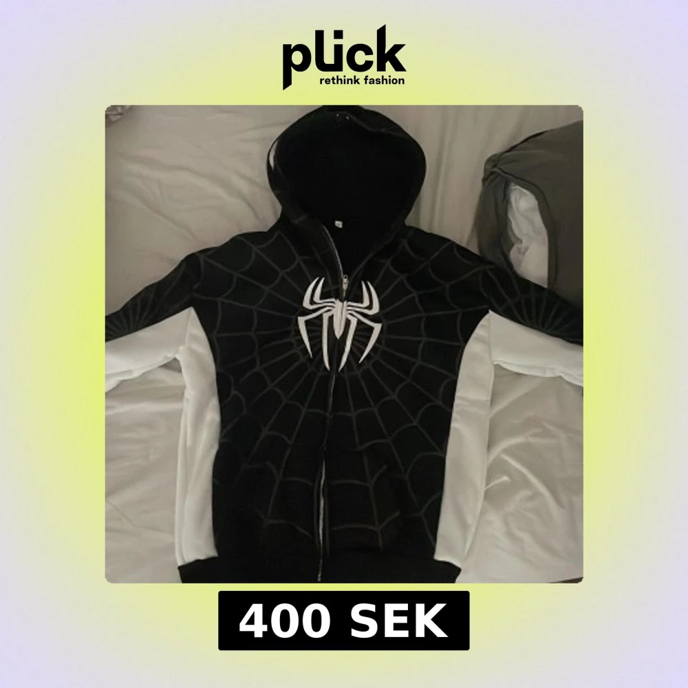Två hoodies med Spider-Man-tema, en i svart och vit med spindelnätsmönster och stor vit spindel på bröstet, och en i vit och rosa med rosa spindeltryck. Båda har huva, lång ärm och dragkedja framtill. Perfekt för dig som gillar Marvel och vill sticka ut.