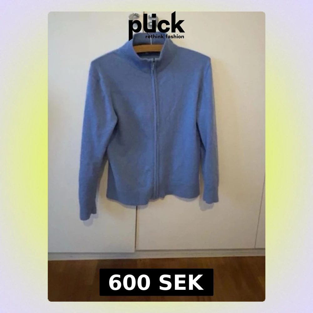Ljusblå stickad tröja med dragkedja framtill och hög krage. Tröjan har långa ärmar och ribbade muddar vid krage, ärmslut och nederkant. Perfekt för lager-på-lager. Finns en liten defekt (bild 4)