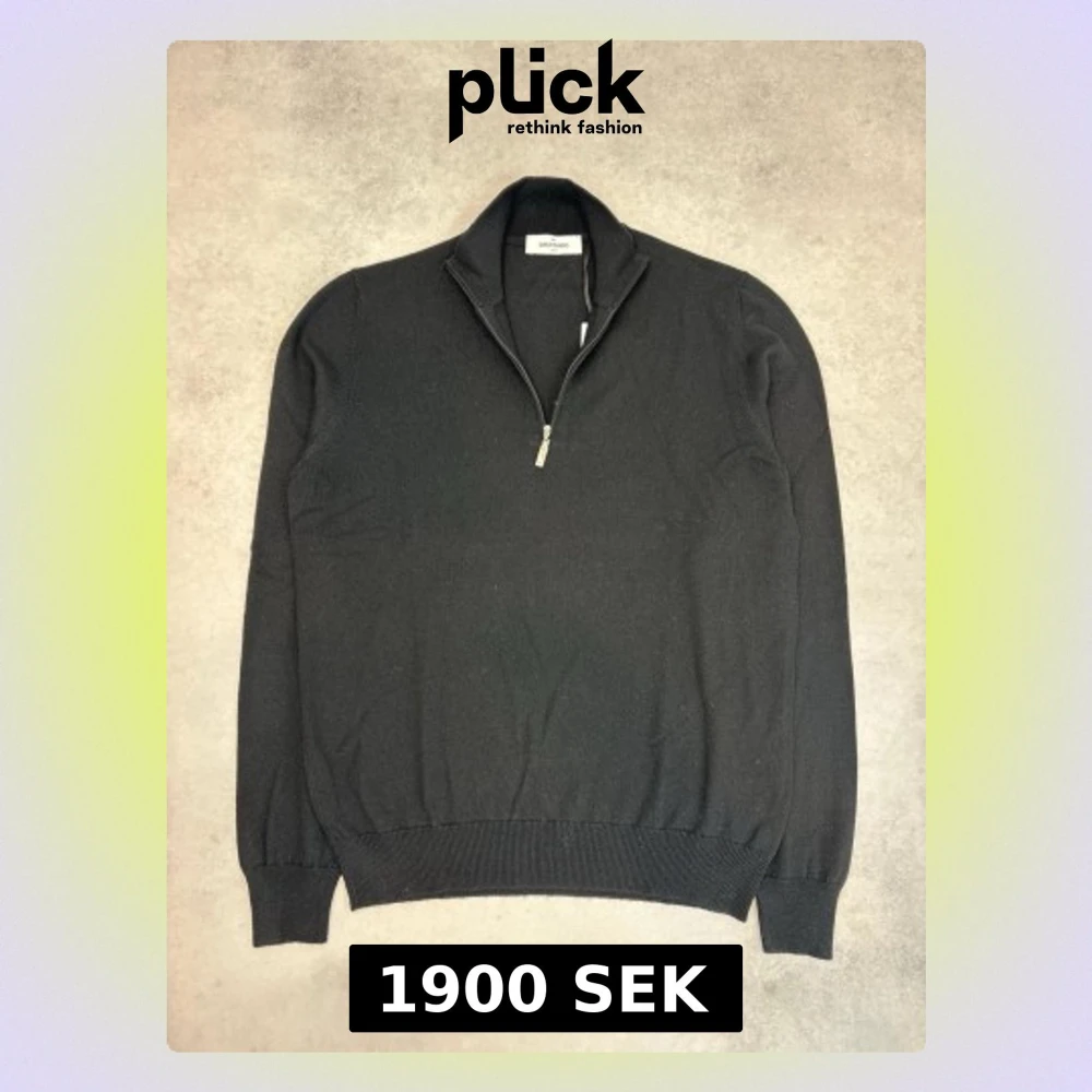 Klassisk svart stickad tröja från Gran Sasso med halv dragkedja och hög krage. Tröjan har ribbade muddar vid ärmslut och nederkant. Perfekt för en stilren och enkel look. Tillverkad i mjukt material för extra komfort. Vi har tröjan i både storlek M och L.