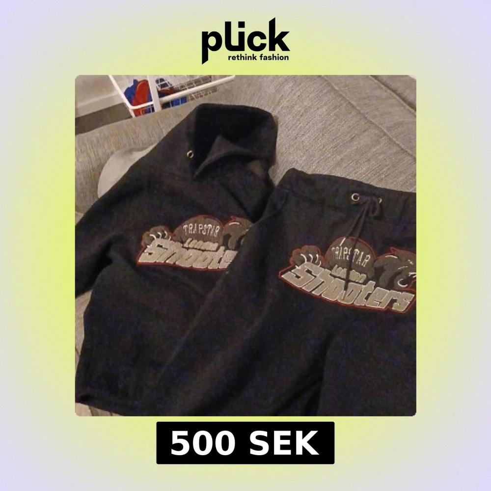 Säljer en svart hoodie från Trapstar med tryck på framsidan. Hoodien har en klassisk passform med dragsko i huvan och ribbade muddar vid ärmslut och nederkant. Perfekt för en avslappnad stil. Storlek S men sitter som M