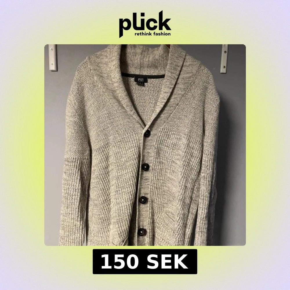 Säljer en grå/ljus beige stickad kofta från F&F i storlek M. Koftan har bred krage, långa ärmar och stängs med fyra svarta knappar framtill. Den är ribbstickad på ärmar och nedre delen, vilket ger en snygg struktur. Perfekt för lager-på-lager under kyliga dagar.