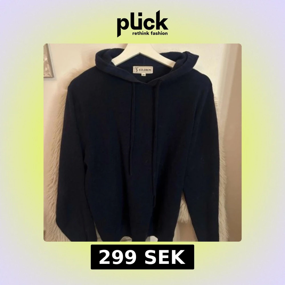 Säljer en stilren mörkblå hoodie från Studios i storlek M. Tröjan är cashmere och slutsåld överallt! Nypris 1000, ett litet hål har den som går säkret o sy men annars fin.