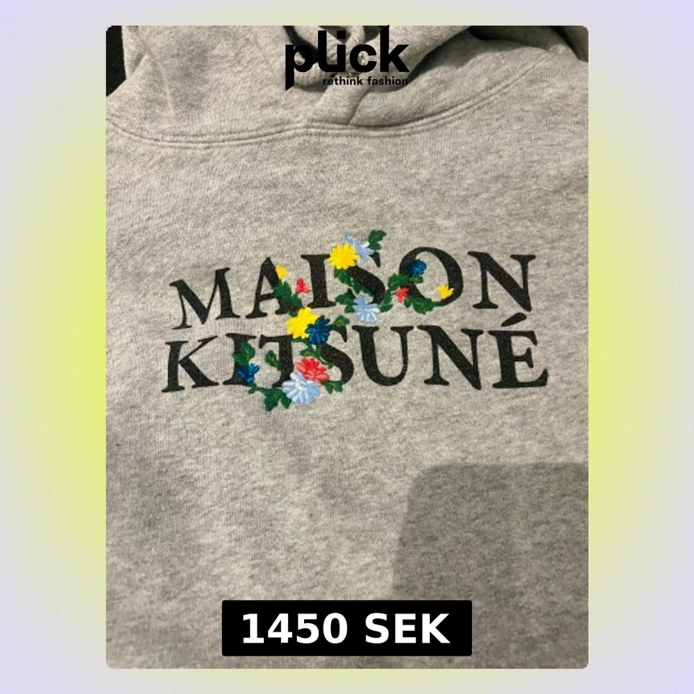 Grå hoodie från Maison Kitsuné med broderad logga och färgglada blommor på bröstet. Storlek S, inte andvänd jättemycket och tvättad rätt. Skickas direkt