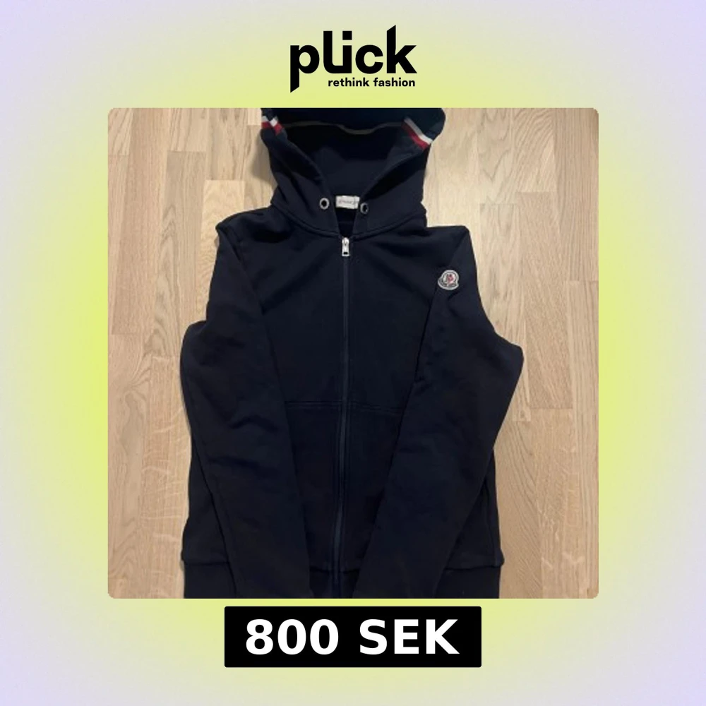 Säljer en mörkblå huvtröja från Moncler med dragkedja och klassisk logga på ärmen. Storlek M men passar mellan S-M. Den är i bra skick MEN har ett lagat hål på ärmen som du ser på sista bilden och därför är priset lite längre.
