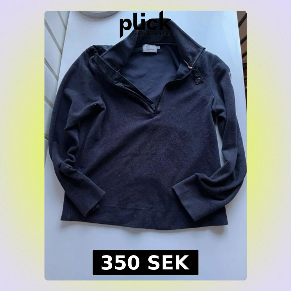Säljer en mörkblå fleece tröja från Moncler Grenoble med halv dragkedja och hög krage. Tröjan har broderad logga på ärmen och är långärmad. Perfekt för kyliga dagar och riktigt skön att ha på sig.