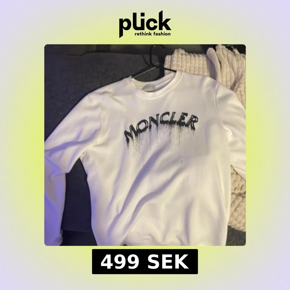 Säljer en clean vit sweatshirt från Moncler med svart drip-printad logga framtill och klassisk broderad Moncler-patch på ärmen. Tröjan har rund hals och är långärmad, perfekt för dig som gillar streetwear och exklusiva märken.