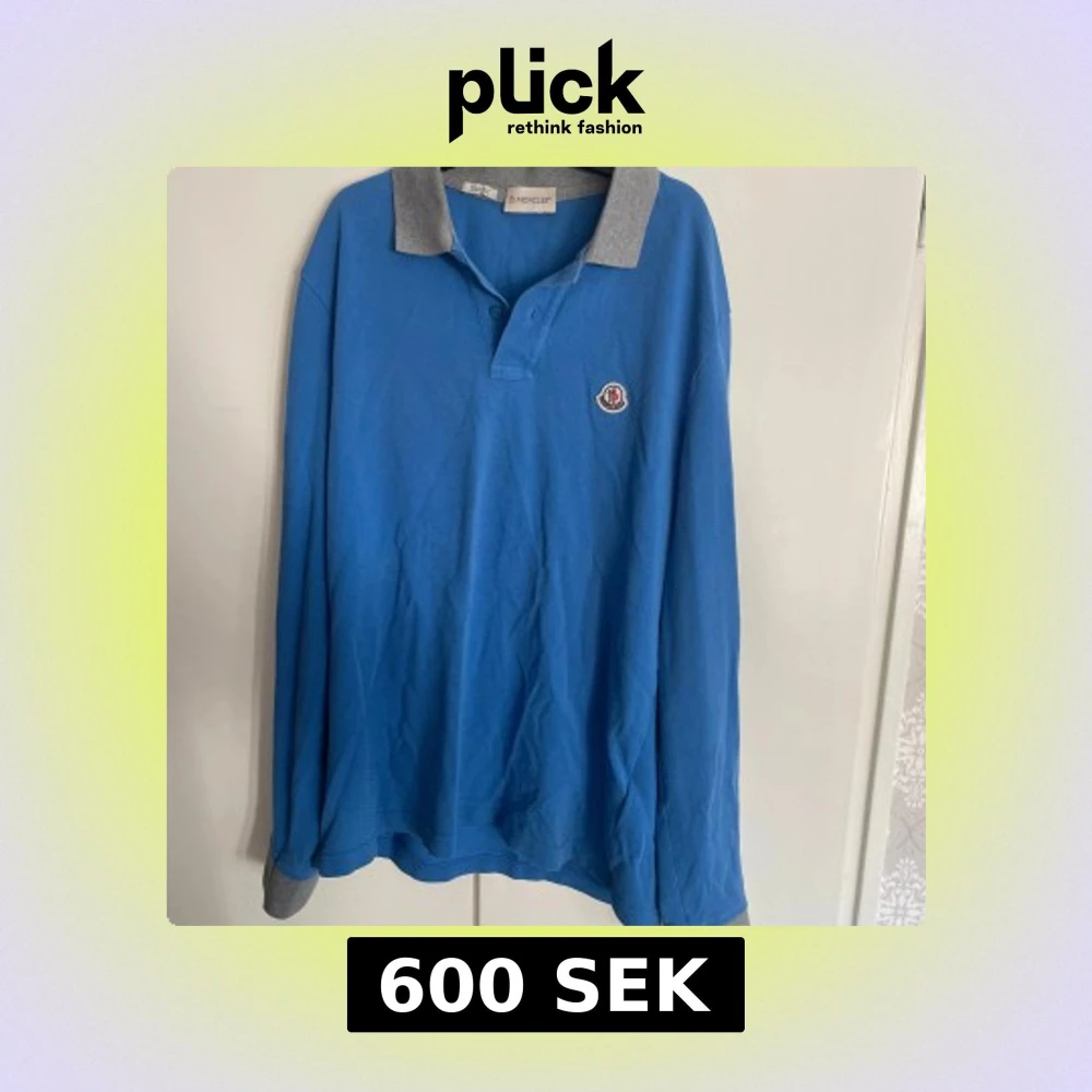Säljer en blå långärmad pikétröja från Moncler storlek M med grå krage och muddar. Tröjan har klassisk pikéknäppning och Moncler-logga på bröstet. Perfekt för en sportig och stilren look. Nyskick knappt använd.