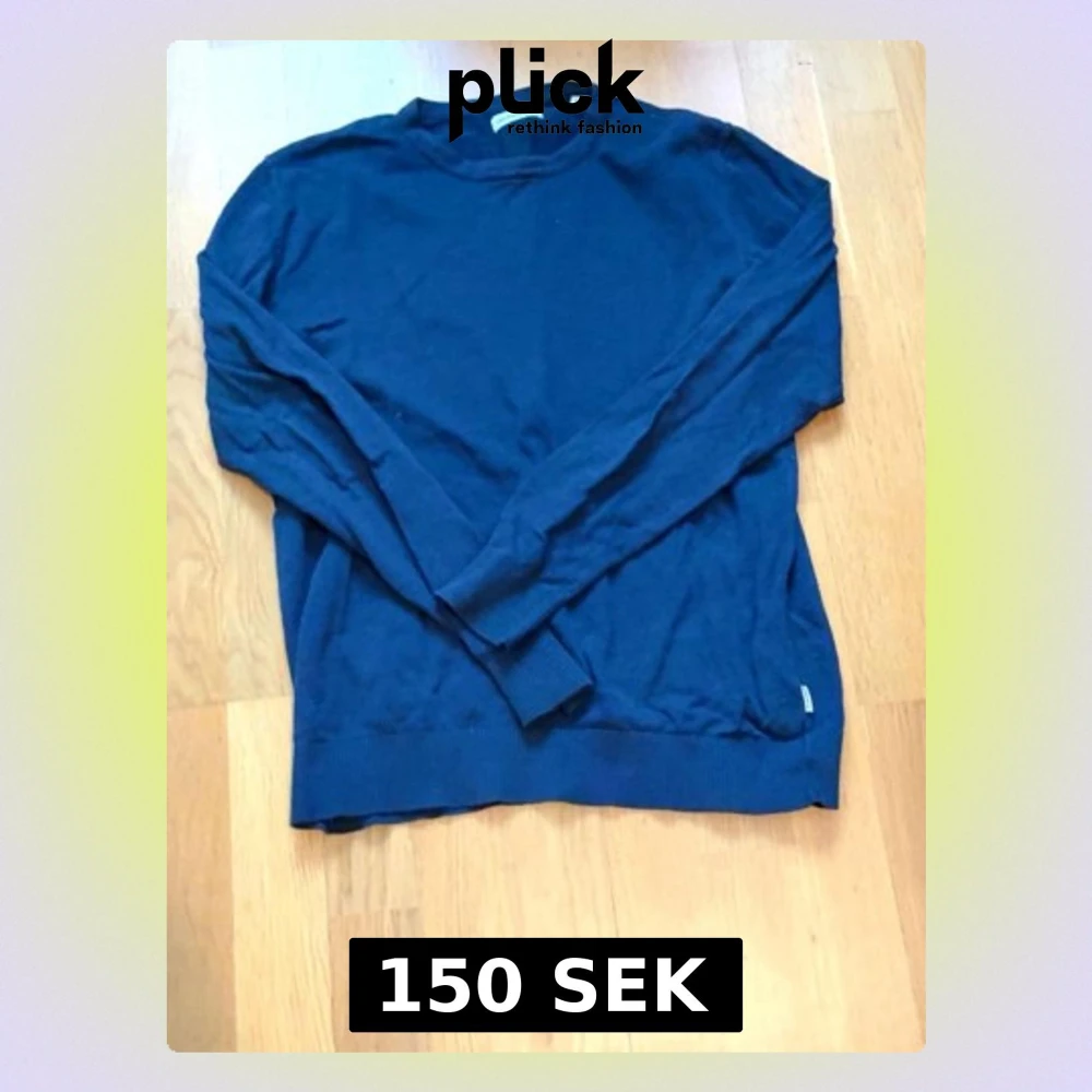 En enkel och stilren mörkblå tröja med rund halsringning och långa ärmar. Tröjan har ribbade muddar vid ärmslut och nederkant, perfekt för en clean och avslappnad look. Materialet ser ut att vara mjukt och lätt, passar bra till jeans eller chinos.