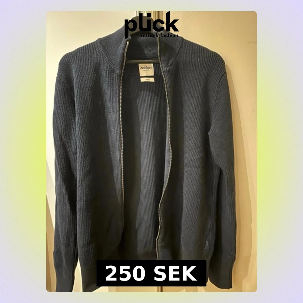 Mörkblå stickad cardigan från Dobber med dubbelzip. Tröjan är använd men fortfarande i gott skick.