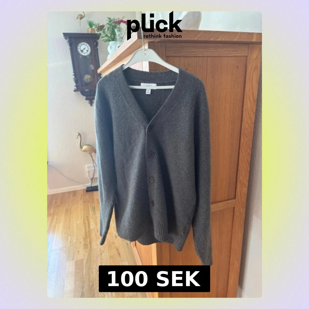 Stilren mörkgrå kofta med v-ringning och fyra knappar framtill. Koftan har ribbade muddar vid ärmslut och nederkant, vilket ger en snygg passform. Perfekt att slänga över en t-shirt för en avslappnad look. Storlek XS.