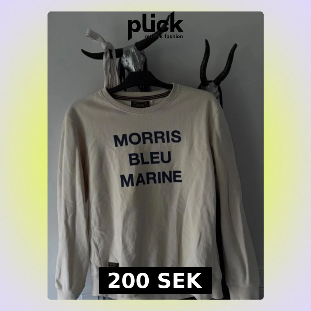 Snygg beige sweatshirt från Morris med mörkblå text 'MORRIS BLEU MARINE' på bröstet. Tröjan har rund hals, långa ärmar och ribbade muddar. Perfekt för dig som gillar stilrena och klassiska plagg med en twist.