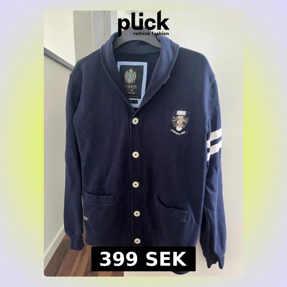 Snygg marinblå cardigan från Morris med vita knappar och två vita ränder på ena ärmen. Tröjan har två fickor framtill och ett broderat märke på bröstet. Skön krage och klassisk collegestil, perfekt för en avslappnad look.