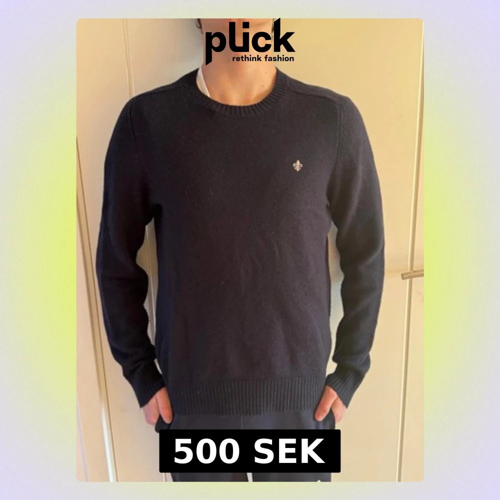 Snygg mörkblå stickad tröja från Morris i storlek S i merino ull. Tröjan har rund hals, ribbade muddar och en liten broderad logga på bröstet. Perfekt för dig som gillar klassisk stil med en modern touch.