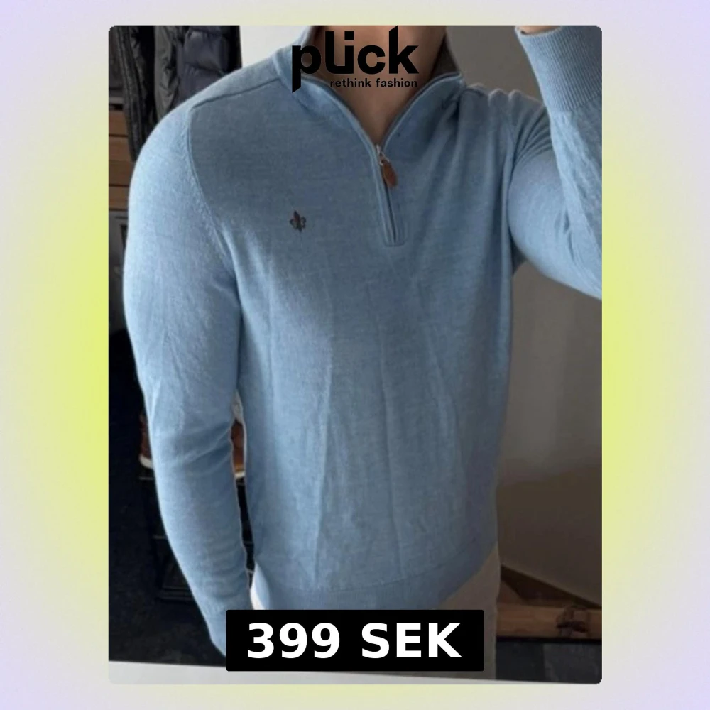Ljusblå stickad tröja från Morris med halv dragkedja och ribbade muddar. Tröjan har en liten broderad logga på bröstet och är tillverkad i mjukt material som passar perfekt till en avslappnad men stilren look. Storlek m men har krympt så sitter som xs