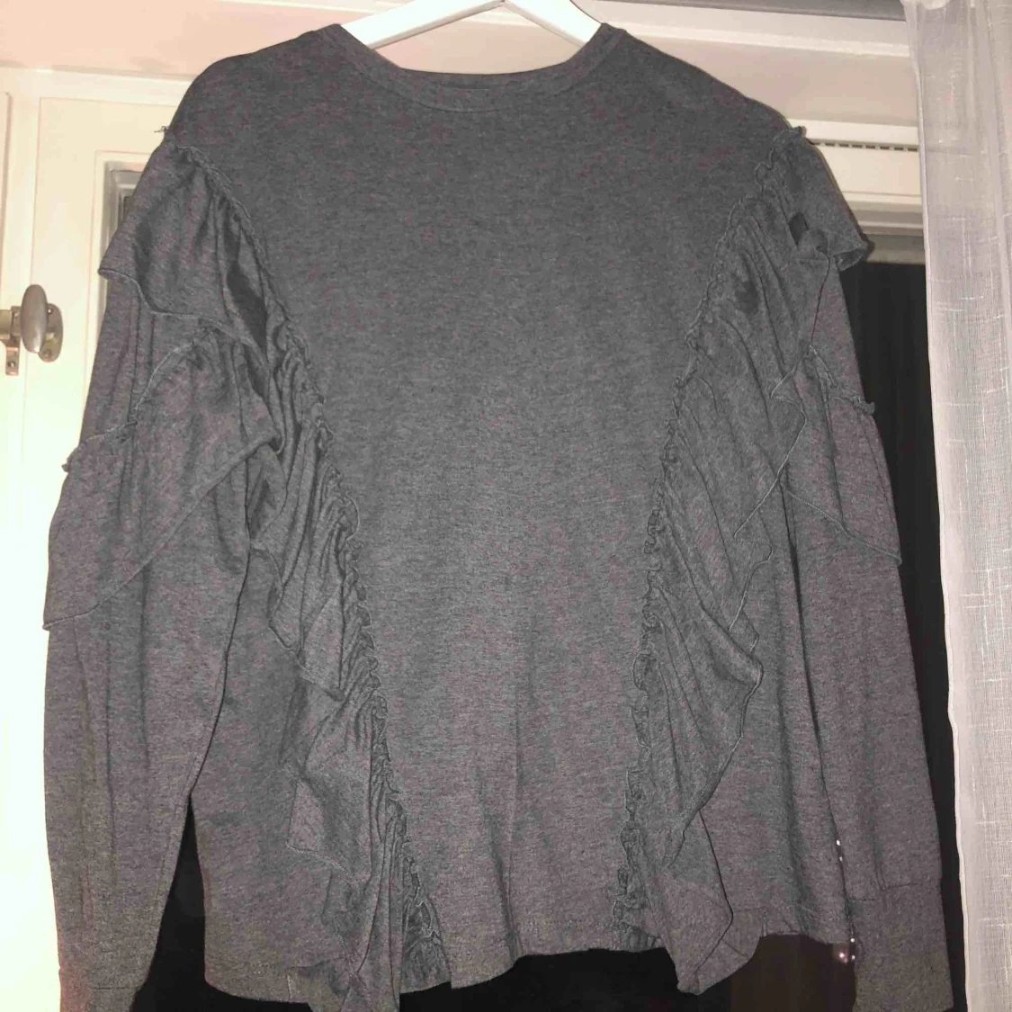 Grå såå skön tröja ifrån NAKD i S. Använd endast 1 gång. Fina volanger på den också. Kan mötas upp eller frakta