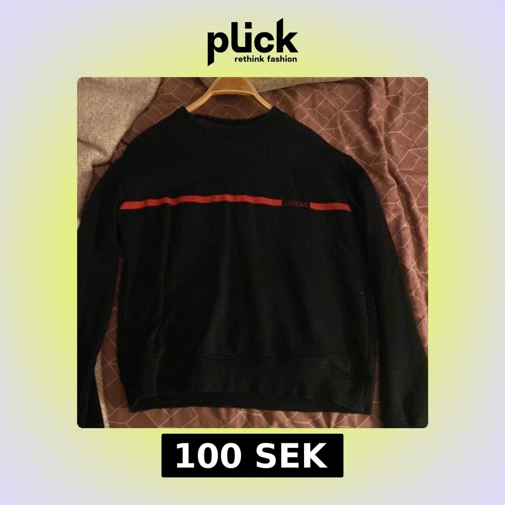 Svart sweatshirt från NA-KD i storlek L med en röd horisontell linje och texten 'J'ADORE' framtill. Tröjan har rund halsringning och långa ärmar, perfekt för en chill och stilren look.