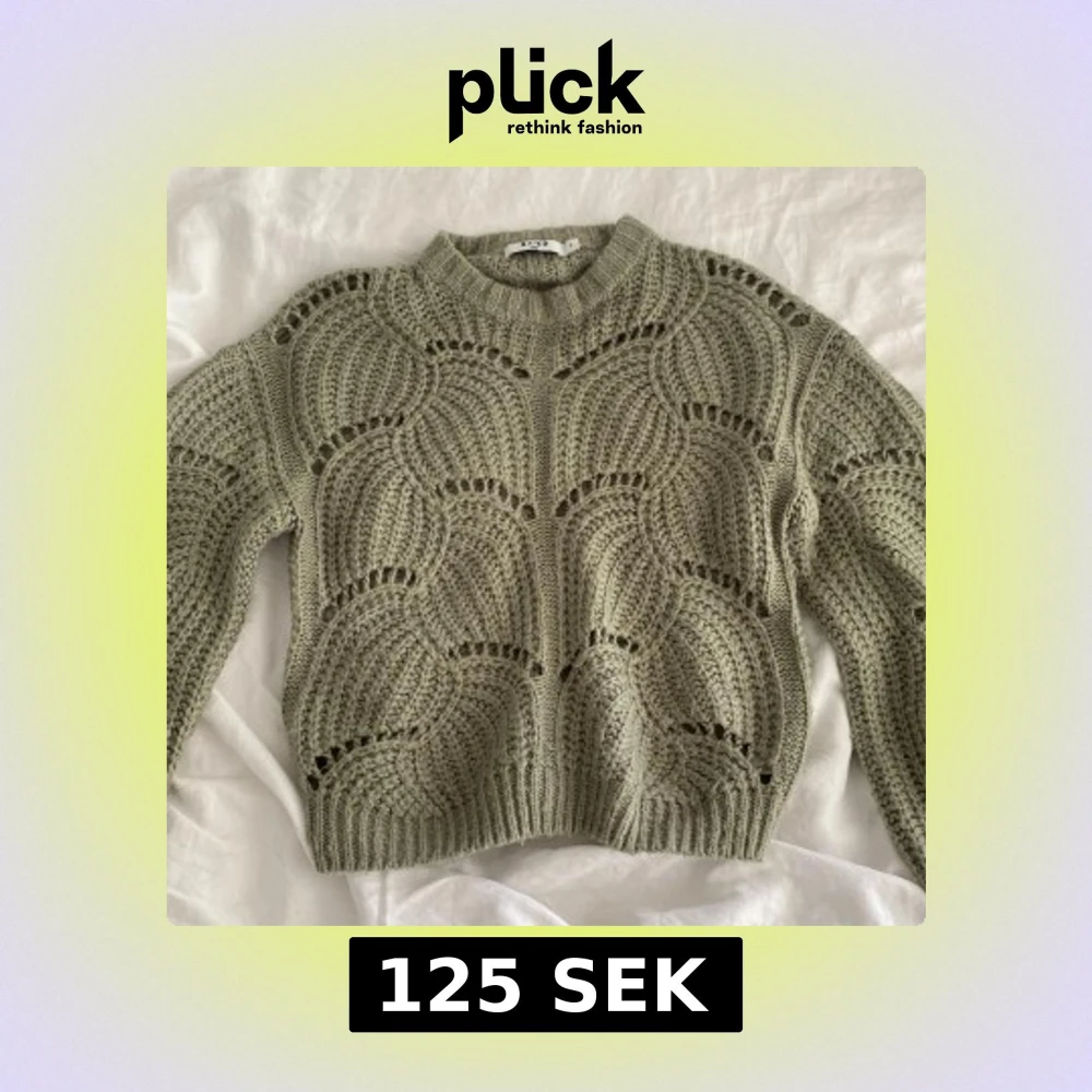 Säljer en snygg ljusgrön stickad tröja från NA-KD i storlek S. Tröjan har ett unikt mönster med bågformade detaljer och är ribbad vid hals, ärmslut och nederkant. Perfekt för lager-på-lager och chill höst- eller vinterstil.