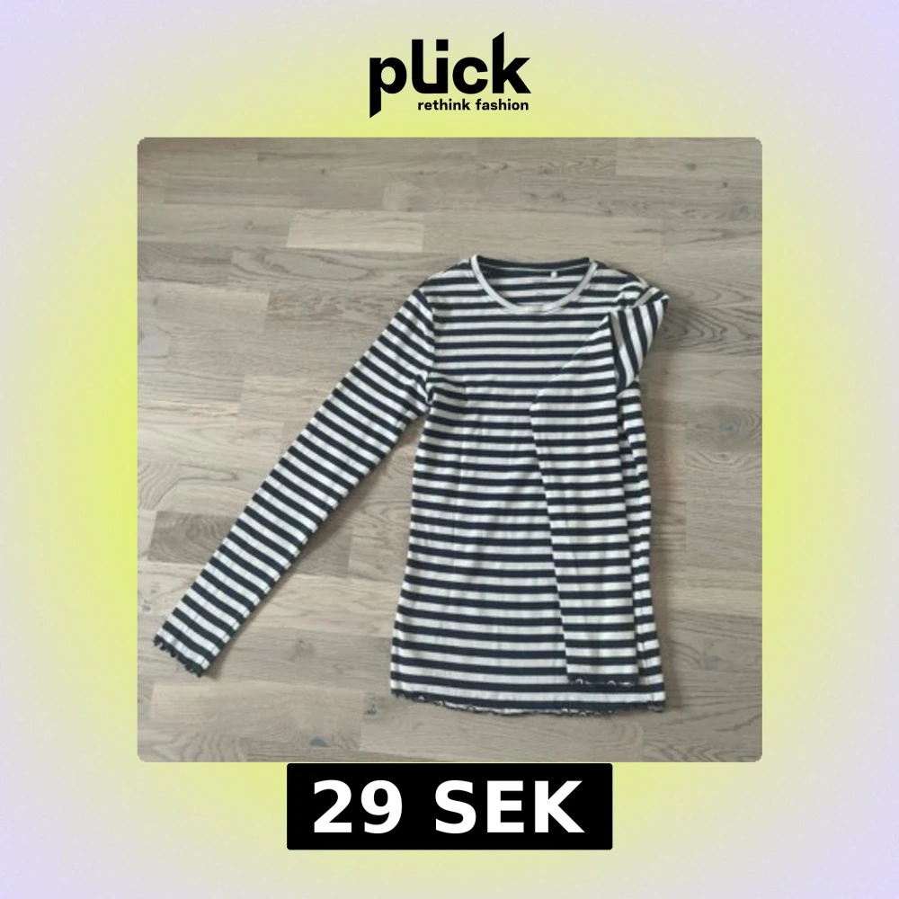 Säljer en svart och vit randig långärmad tröja från Name It i ribbad bomull. Tröjan har smal passform och söta volangdetaljer vid ärmslut och nederkant. Perfekt för dig som gillar klassisk stil med en twist.
