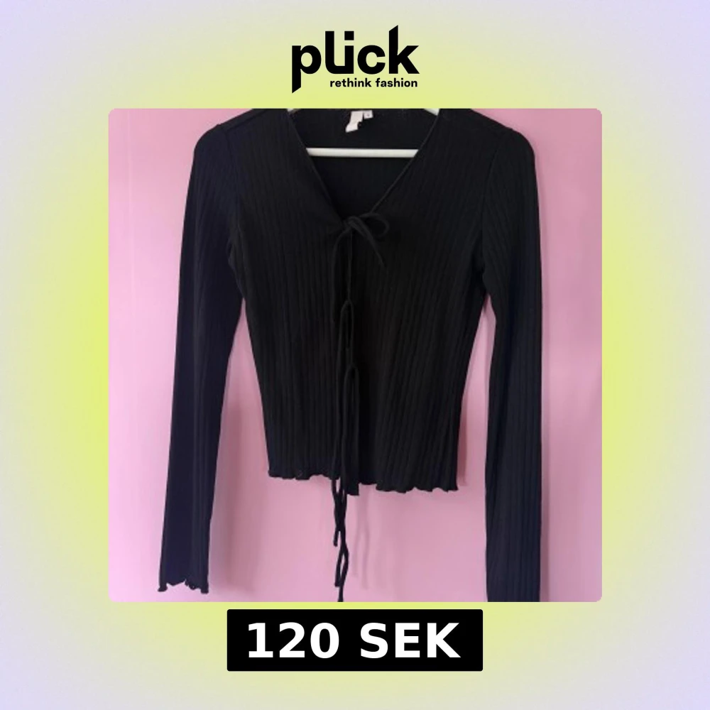 Säljer en svart långärmad ribbad tröja från Nelly med knyt framtill. Tröjan har croppad passform och v-ringning, perfekt till många olika outfits. Använd 2 gånger.