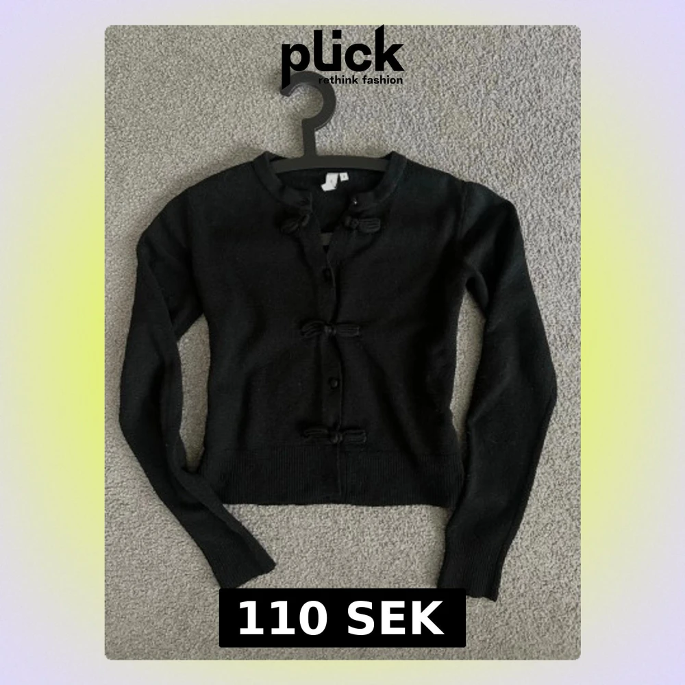 En svart kofta/tröja ifrån Nelly med fina rosetter och knallar framtill. Den går att knäppa upp helt och ha som kofta också! ❣️
