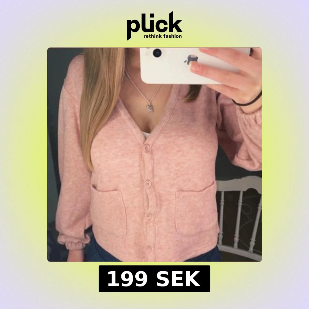 Söt ljusrosa kofta med v-ringning och tre knappar framtill. Tröjan har två fickor och långa ärmar med resår vid handlederna. Perfekt för lager-på-lager och enkel att matcha med olika outfits.