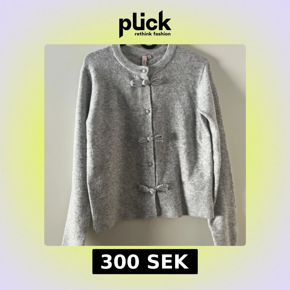 Säljer en stilren grå kofta från Nelly med dekorativa knytrosetter framtill. Koftan har långa ärmar och ribbade muddar vid ärmslut och nederkant. Perfekt för kyligare dagar.